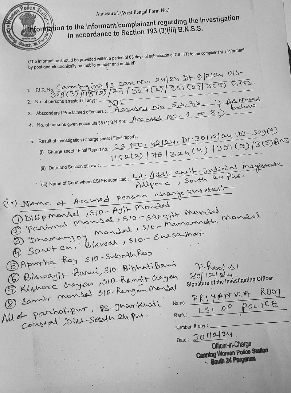 An FIR was promptly lodged at the Canning Police Station on July 9, 2024. Following investigation, the police charge sheeted the case on December 30, 2024, marking a formal step in the legal process to seek justice for the victims and hold the perpetrators accountable.